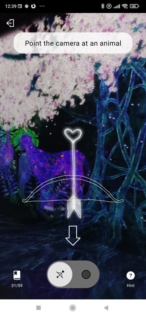 Via une application mobile, ersatz de Pokemon Go, on peut cibler un animal en réalité augmentée et le capturer au moyen de flèches et de filets virtuels. Une fois capturé, on débloque une fiche explicative sur l’animal en question. Pas d’inquiétude Brigitte Anderson et Pamela Bardot, on ne tue pas les animaux (ils sont qui plus est déjà en voie d’extinction), les flèches n’ont pas de bout pointu, c’est un bout en forme de cœur (plus-petit-que-3), et avant de pouvoir capturer un autre animal il faut relâcher le précédent. Cela doit prendre du temps de compléter le bestiaire virtuel, il y a 59 espèces différentes. Très très déçu qu’il n’y ait pas de classement d’ailleurs. Je me rattraperai sur Sujimon.