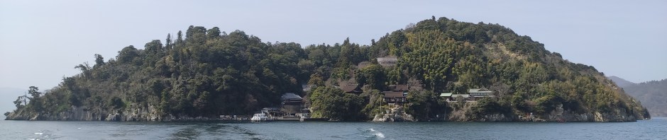 Après une quarantaine de minutes, le bateau accoste sur l’île. Quelques boutiques de souvenirs et de restauration basique à base de brochettes et de fritures sont sur le chemin, qui grimpe rapidement sous forme d’escaliers vers un templexe bouddhiste (Hogonji) mitoyen d’un sanctuaire shintô. Ici comme ailleurs au Japon les deux religions cohabitent (le cri d’amour du crapaud encore une référence desprogienne) en un syncrétisme évident.