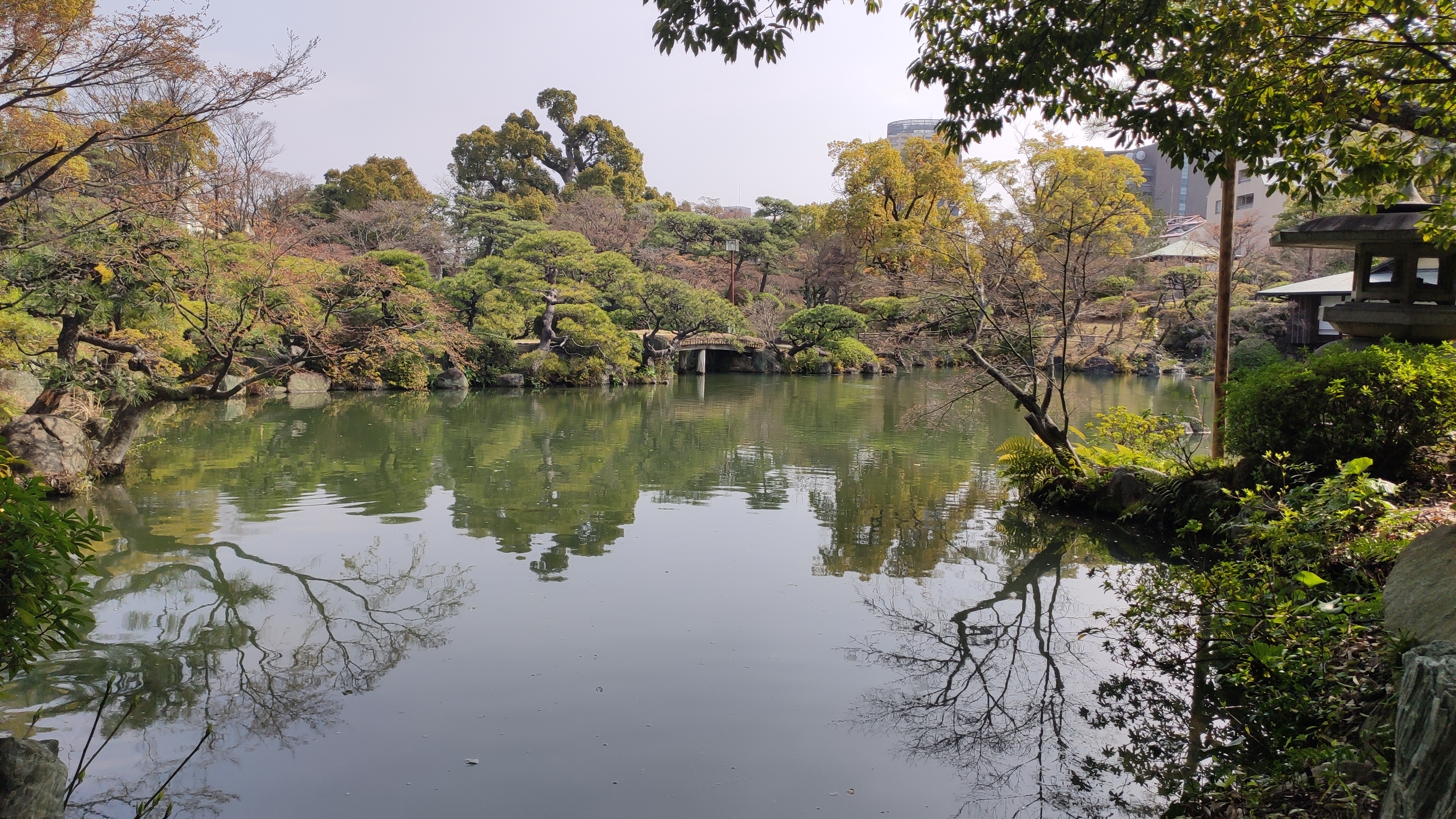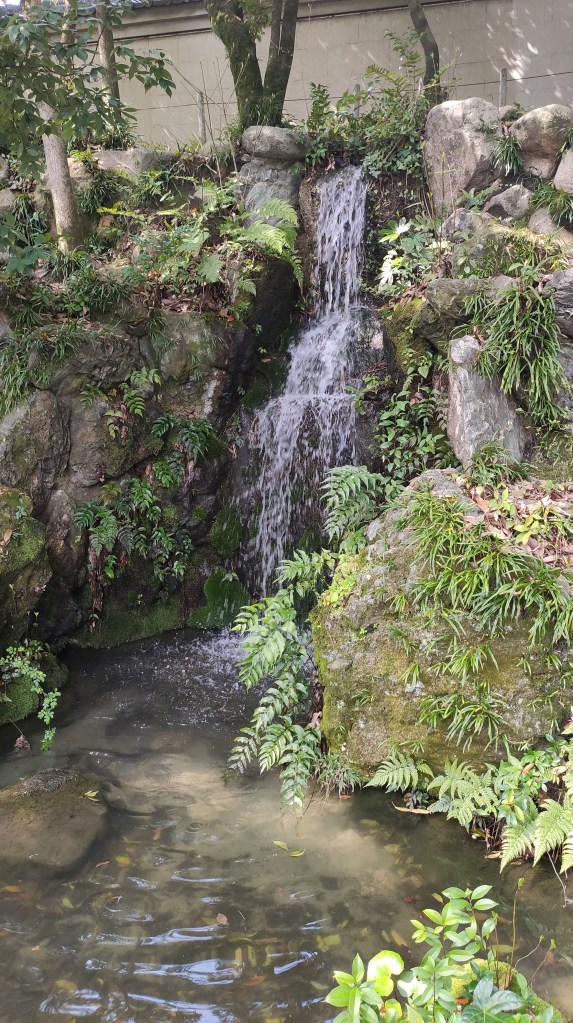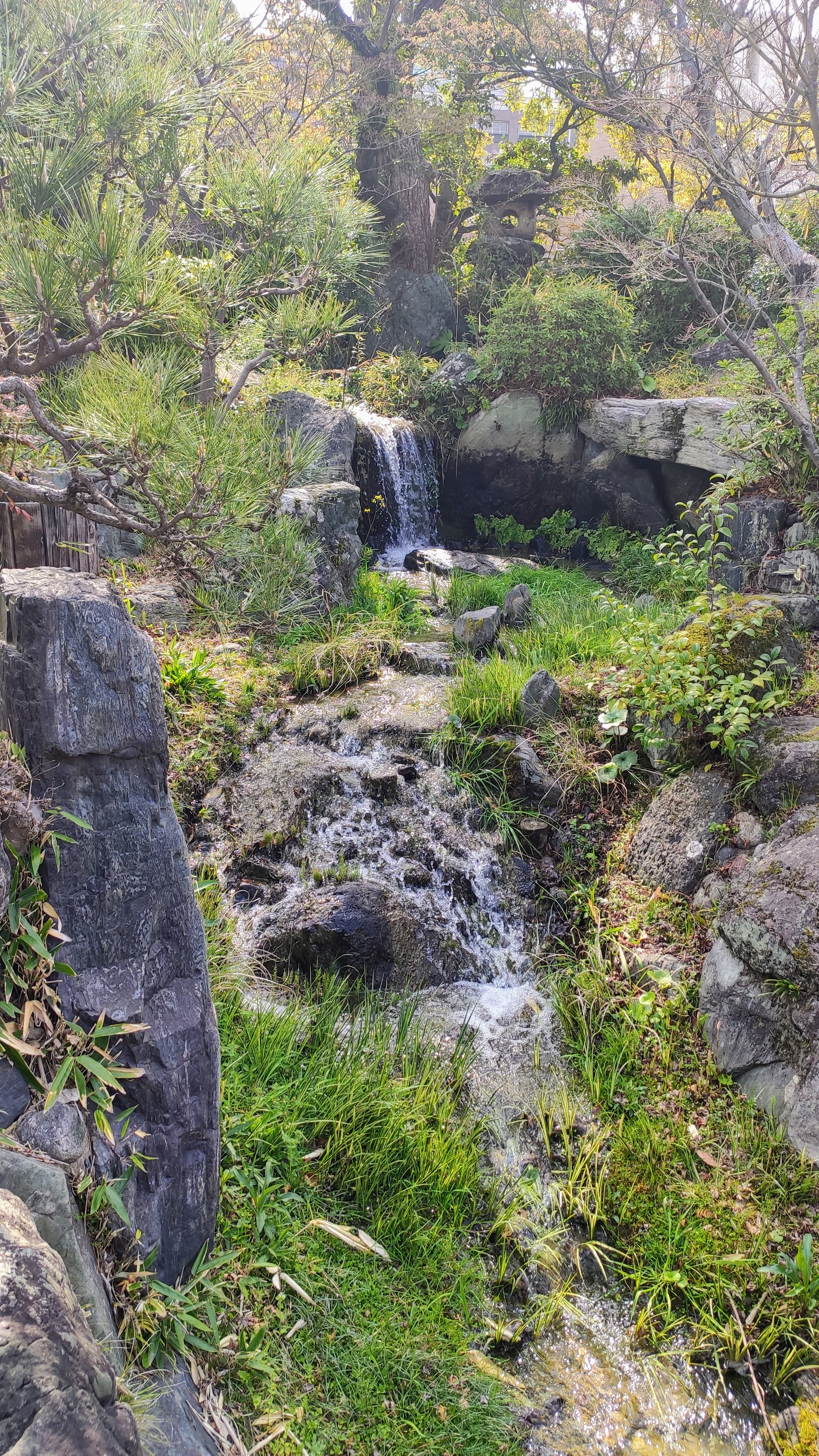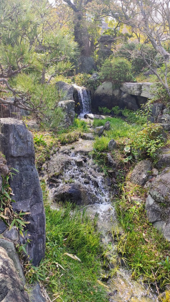 Le jardin japonais est classique et resserré, avec des cascades qui ruissellent joliment vers un étang où s’ébattent des carpes. A l’écart, une étendue d’herbe avec des bancs permet aux parents de s’asseoir pendant que les enfants s’ébattent sans risque de tomber dans les carpes.