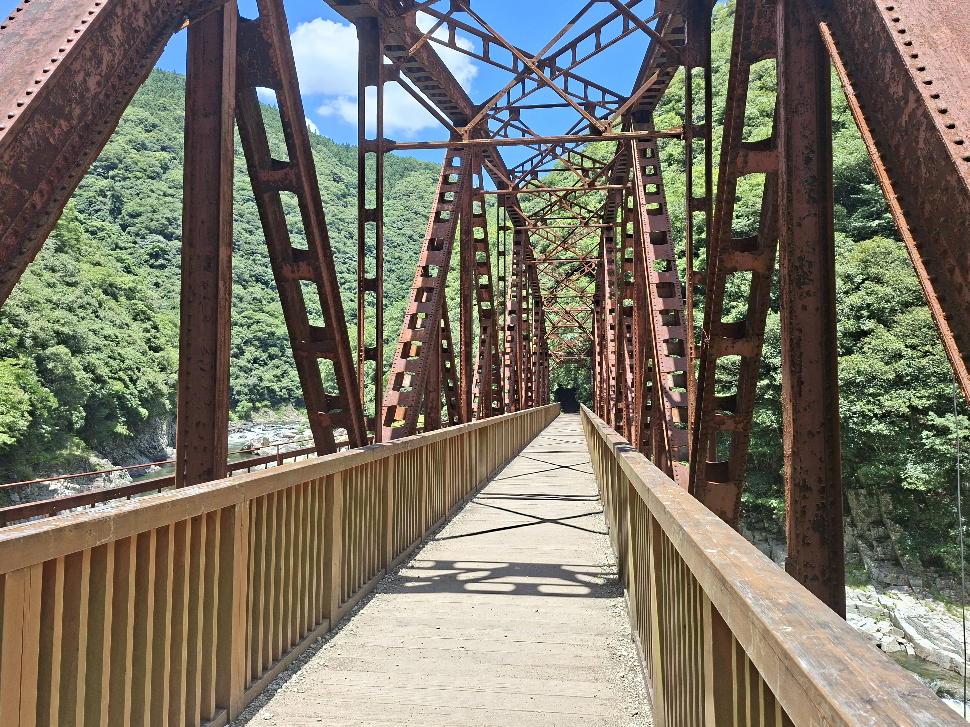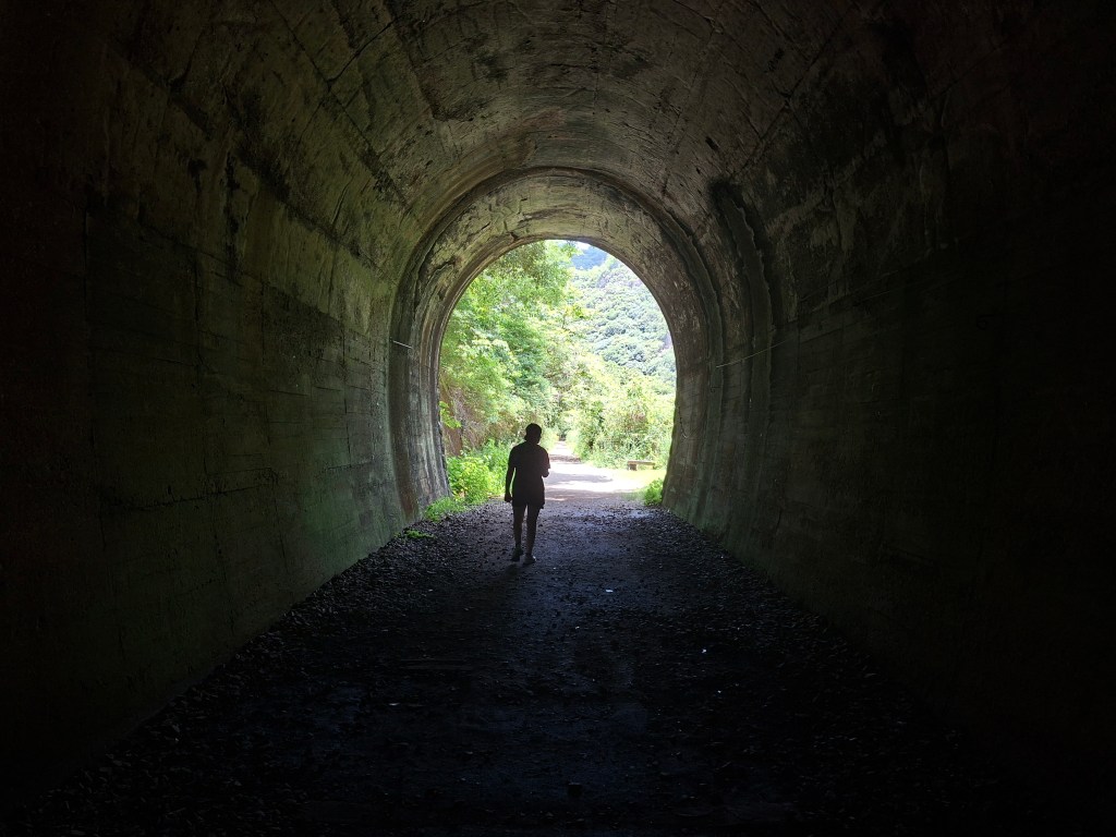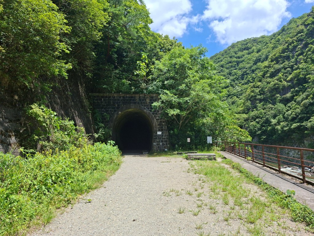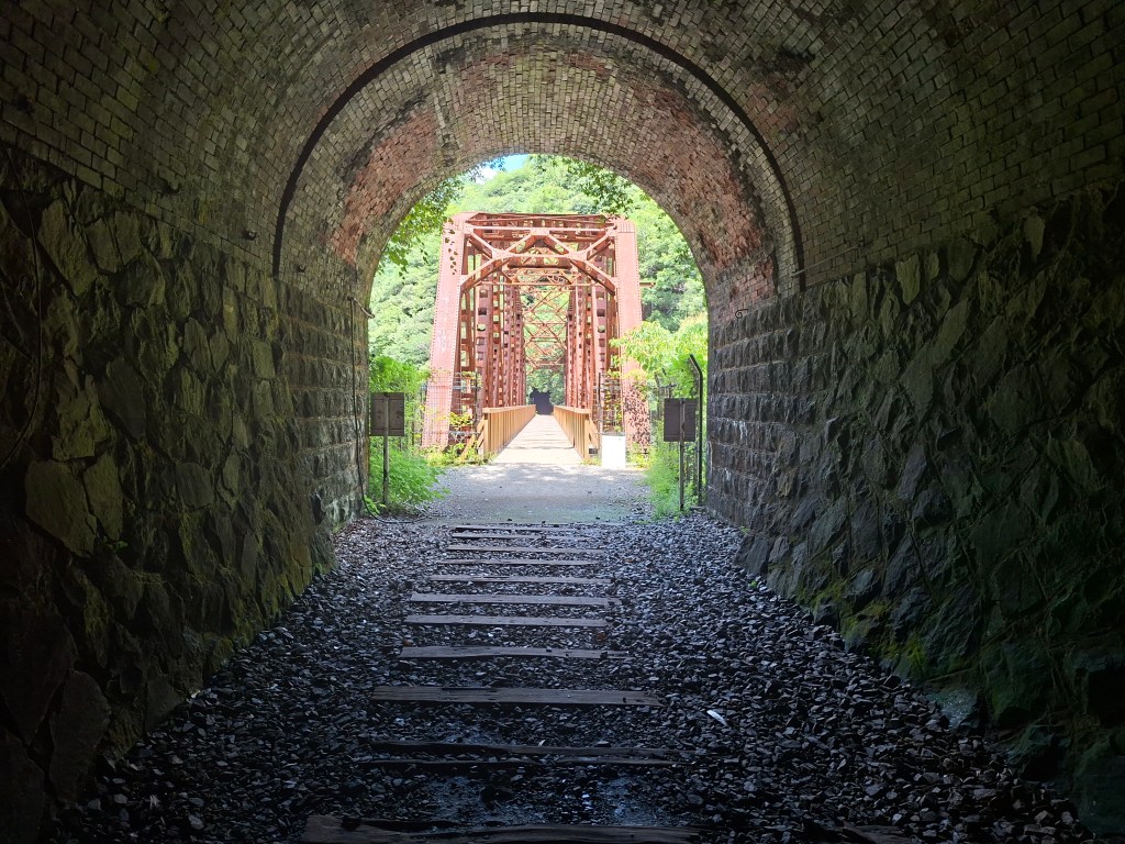 Et ça tombe bien, Emma aime bien l’urbex. Vers 9h nous nous rendons à la gare de Namaze pour faire excursion jusqu’à celle de Takedao, en suivant une ligne de chemin de fer abandonnée depuis 40 ans. elle a depuis été transformée en chemin de randonnée à travers les ouvrages d’art d’origine, ponts et tunnels ferroviaires, sécurisés. Faute de notes précises de mon côté, nous perdons du temps avant de trouver enfin le début du chemin, marqué par la présence d’un cantonnier aussi taciturne que fermé, silencieux et peu bavard.