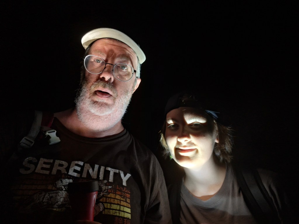 La petite rivière qui passe et les enchaînements de tunnels sont les deux trucs les plus agréables de la ballade: ils nous rafraîchissent. Certains tunnels font environ 350m, et il y fait probablement 15° de moins qu’à l’extérieur. Il y a aussi moins de lumière. Exactement aucune lulmière, nada, nilch, peau’d’zob, nanimo, hormi celle des lampes frontales et torches que nous avons amenés.