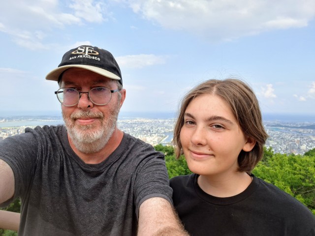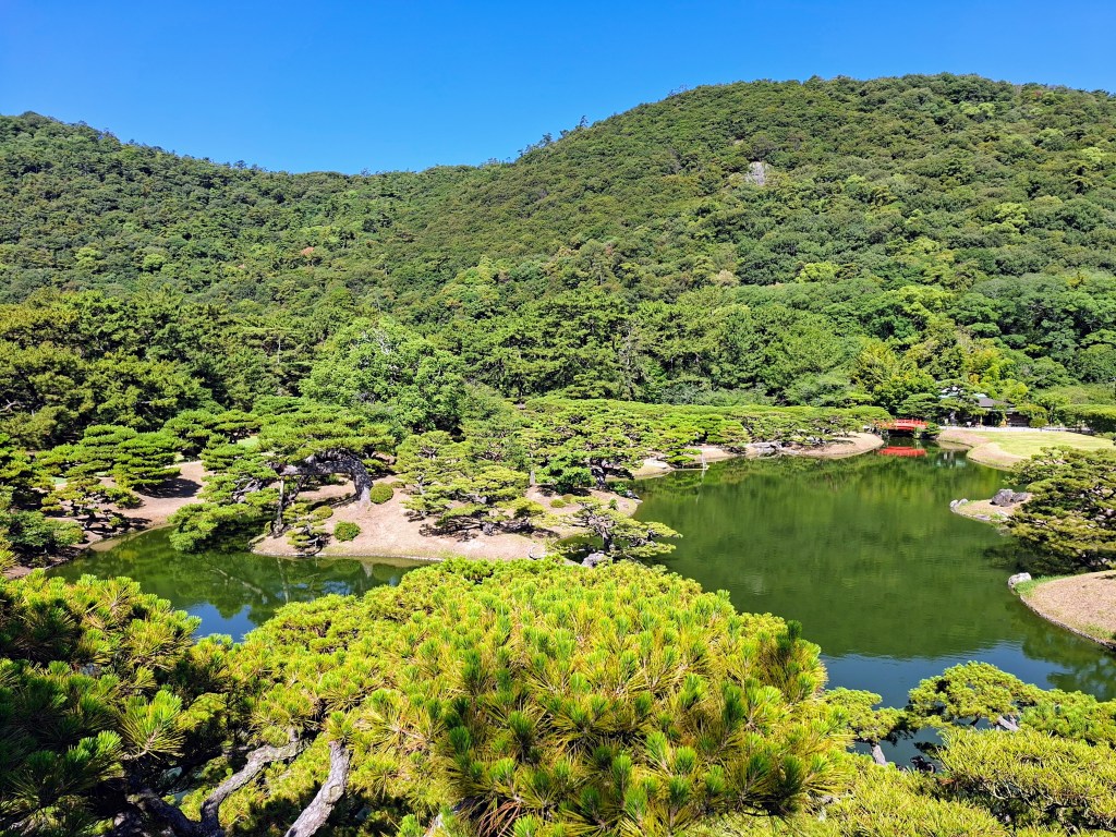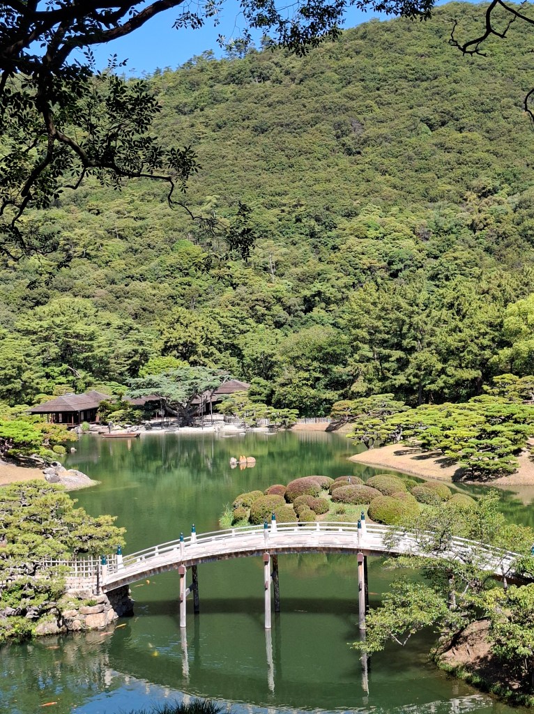 La seconde partie du trajet depuis Ôsaka était plaisante, quand on franchit deux ponts entre Honshû, l’île principale, et Shikoku, la quatrième île du Japon par la taille. Nous n’apercevons pas les célèbres tourbillons de Naruto (la ville, pas le fameux ninja ramenophile, bien que son nom soit indirectement issu de ces tourbillons précis) naissant selon la marée entre le pacifique et la mer intérieure de Seto. Nous discutons avec une femme, voisine d’Emma dans le car. Elle habite tout près du jardin Ritsurin et y marche tous les jours. Nous prévoyions d’y aller avant la fermeture, mais ce sera pour un jour moins mouilleur.