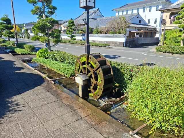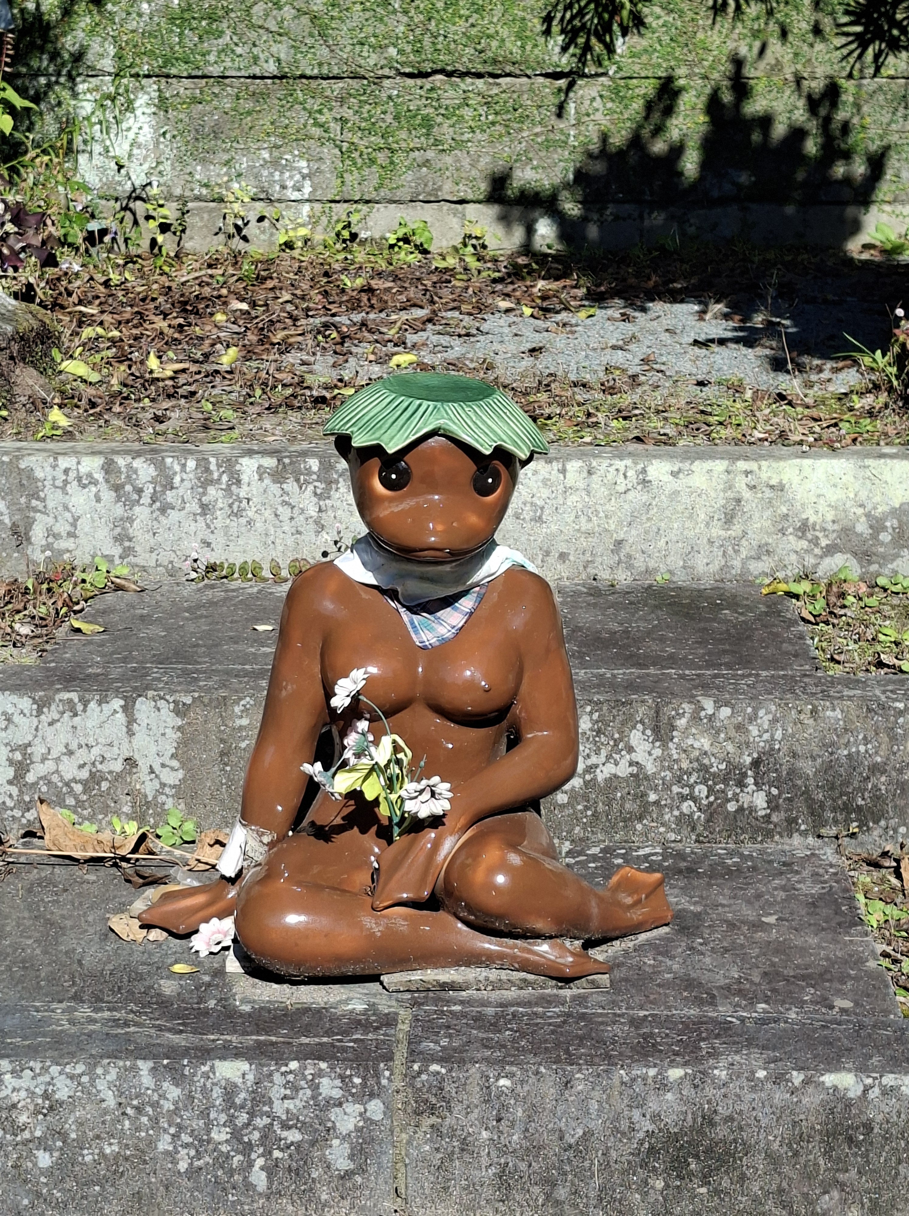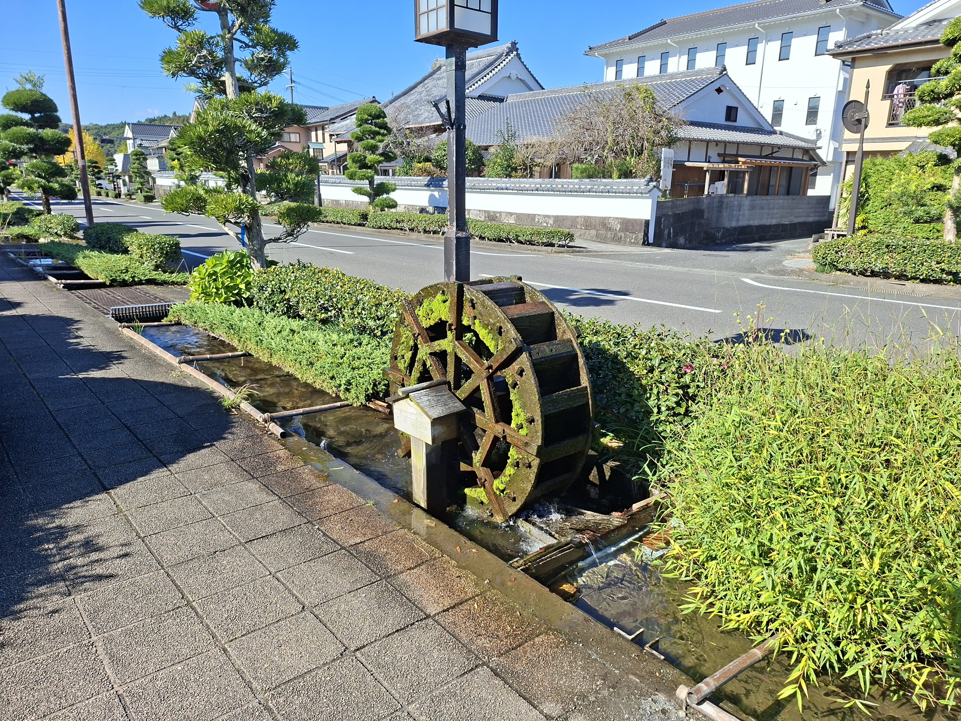De beaux et sereins jardins, dans une ville très jolie. Et il y a des roues et une femelle kappa.