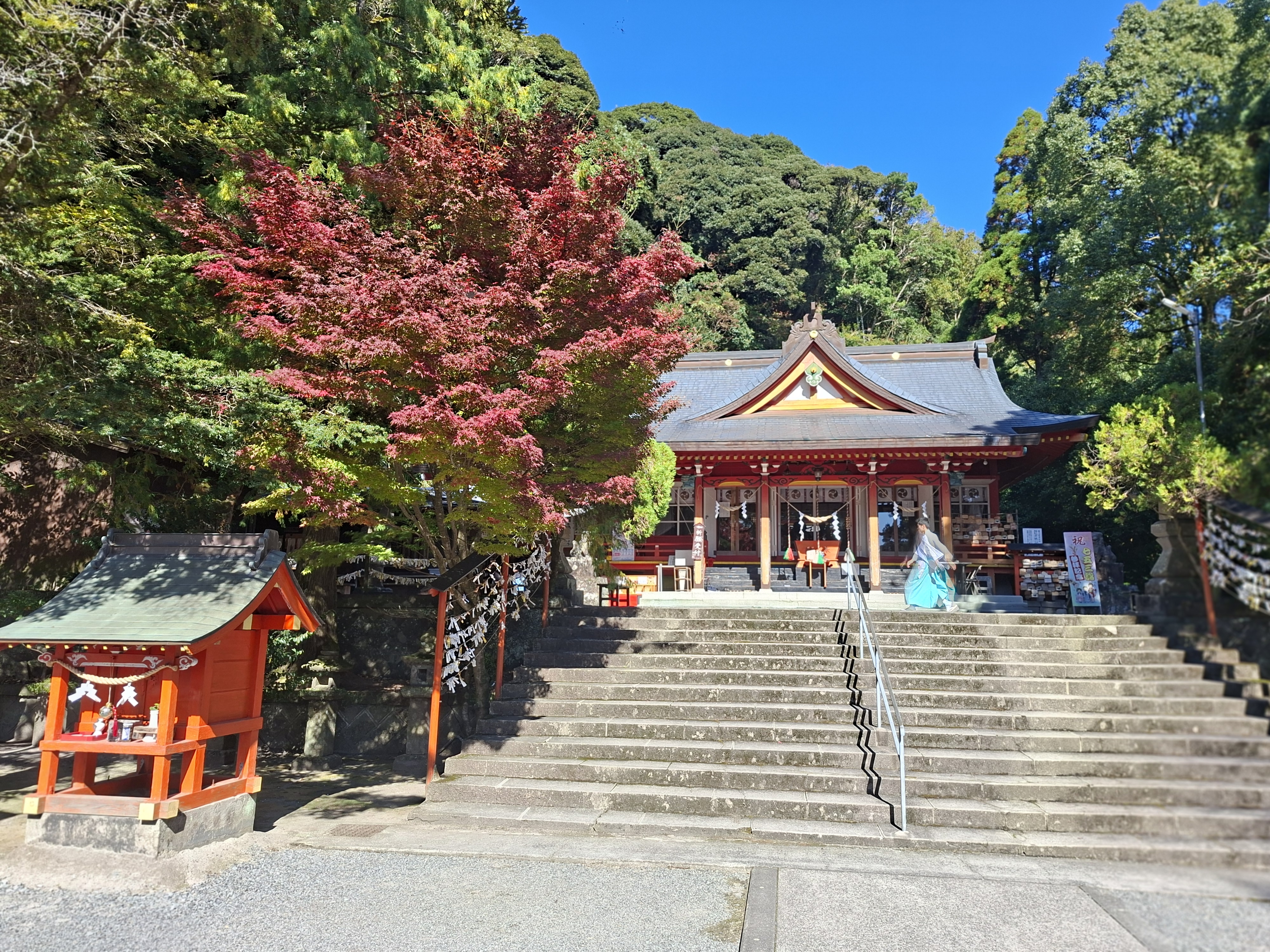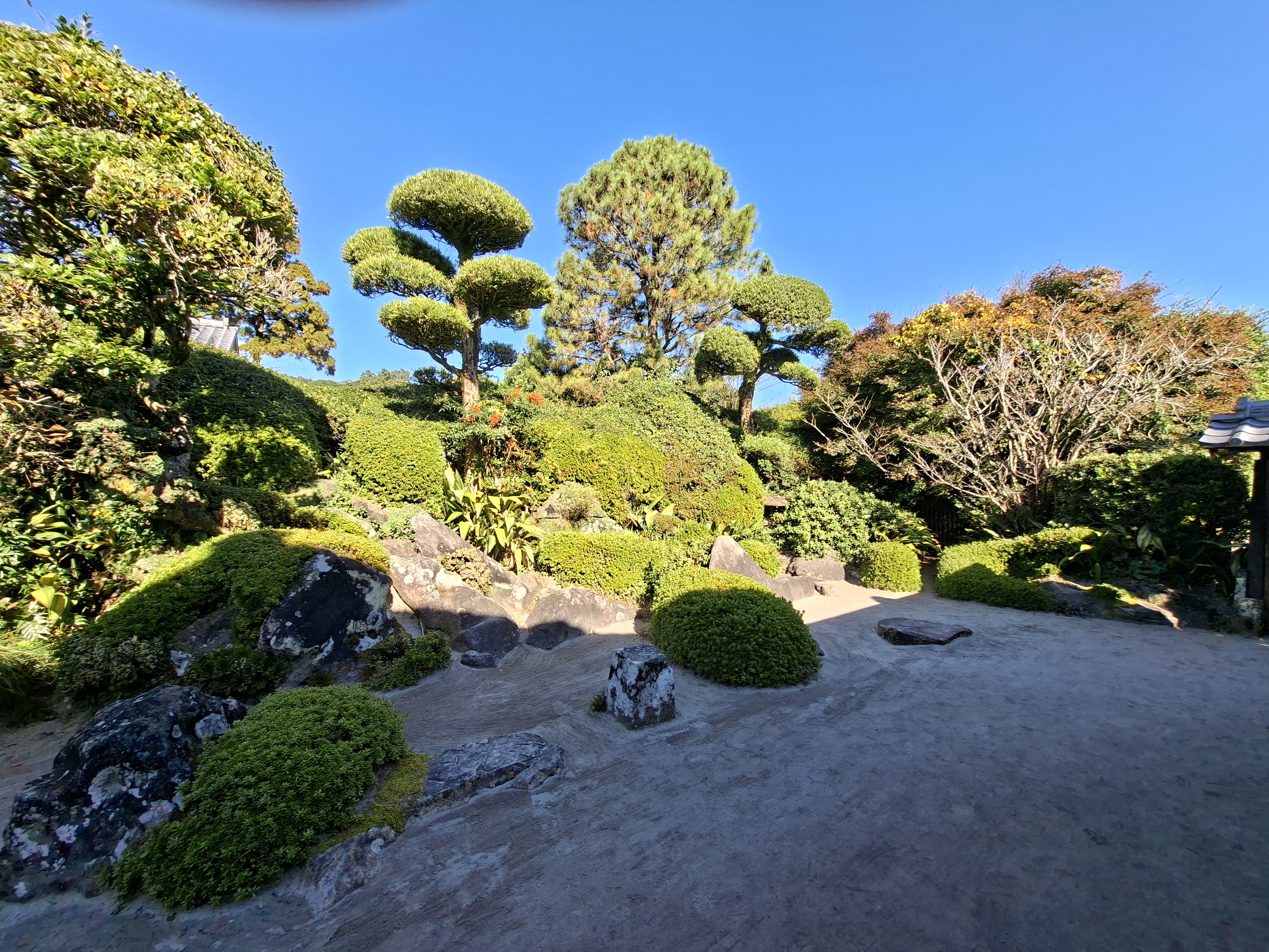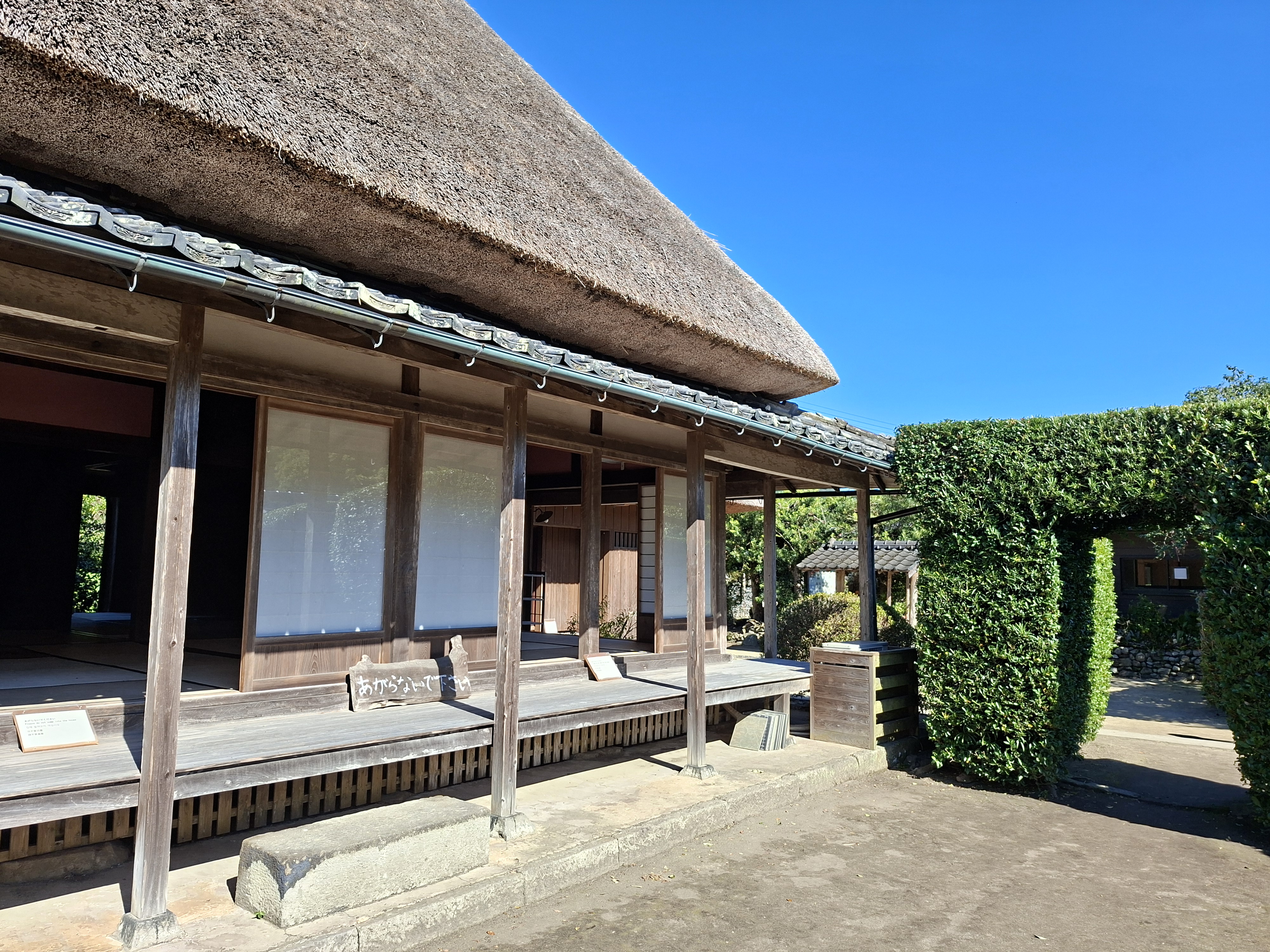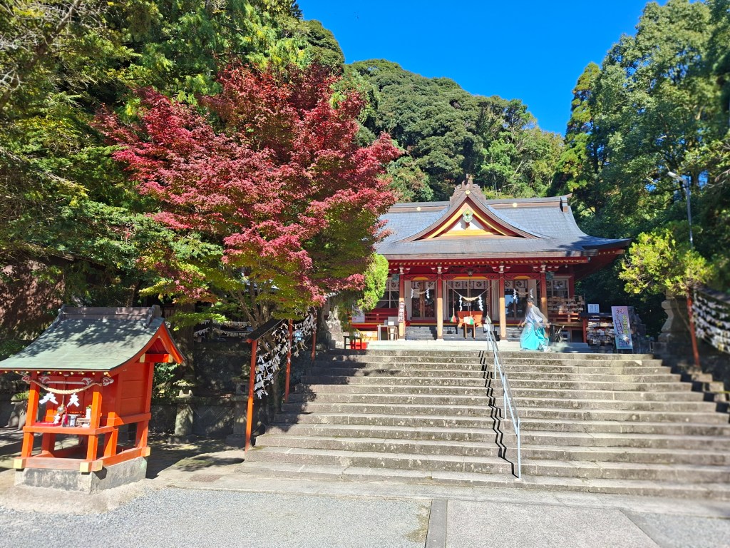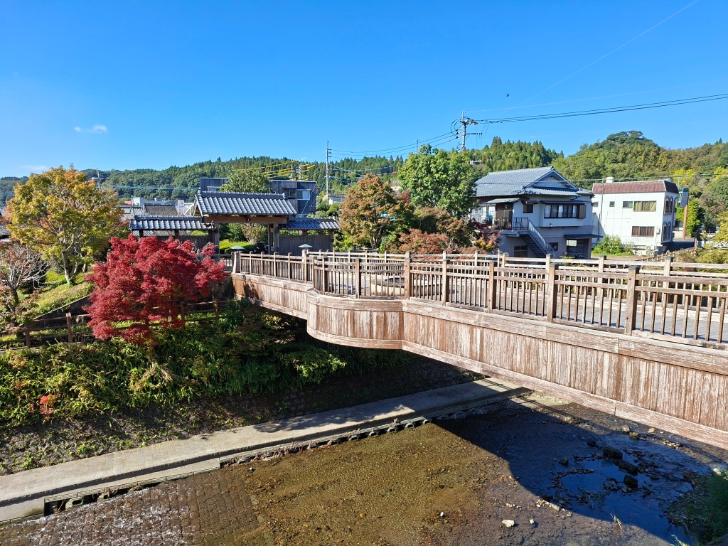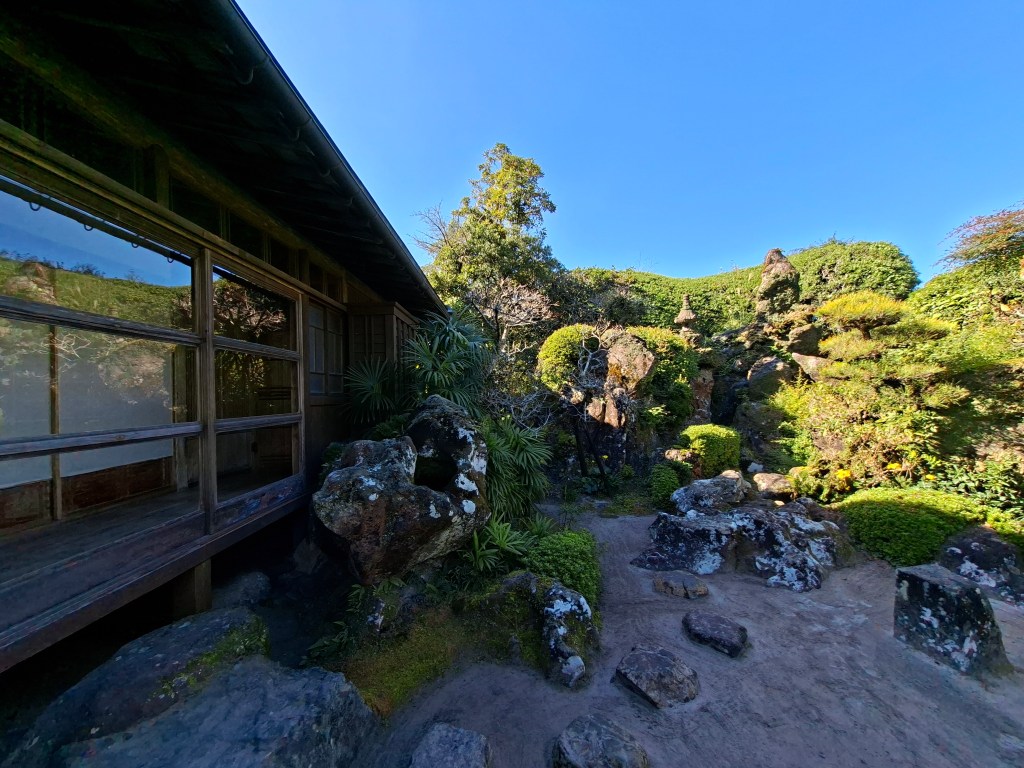 Chiran est rejoint en 80 minutes, soit 4 fois le temps de la douche “rapide” de jeudi. Le bus commence par longer la baie de Kagoshima, permettant d’admirer Sakurajima du côté sud, avec toujours son panache blanc émanant du volcan. Ensuite le bus sinue le long de lacets que j’aimerai pas monter en vélo sans une assistance électrique vénère.