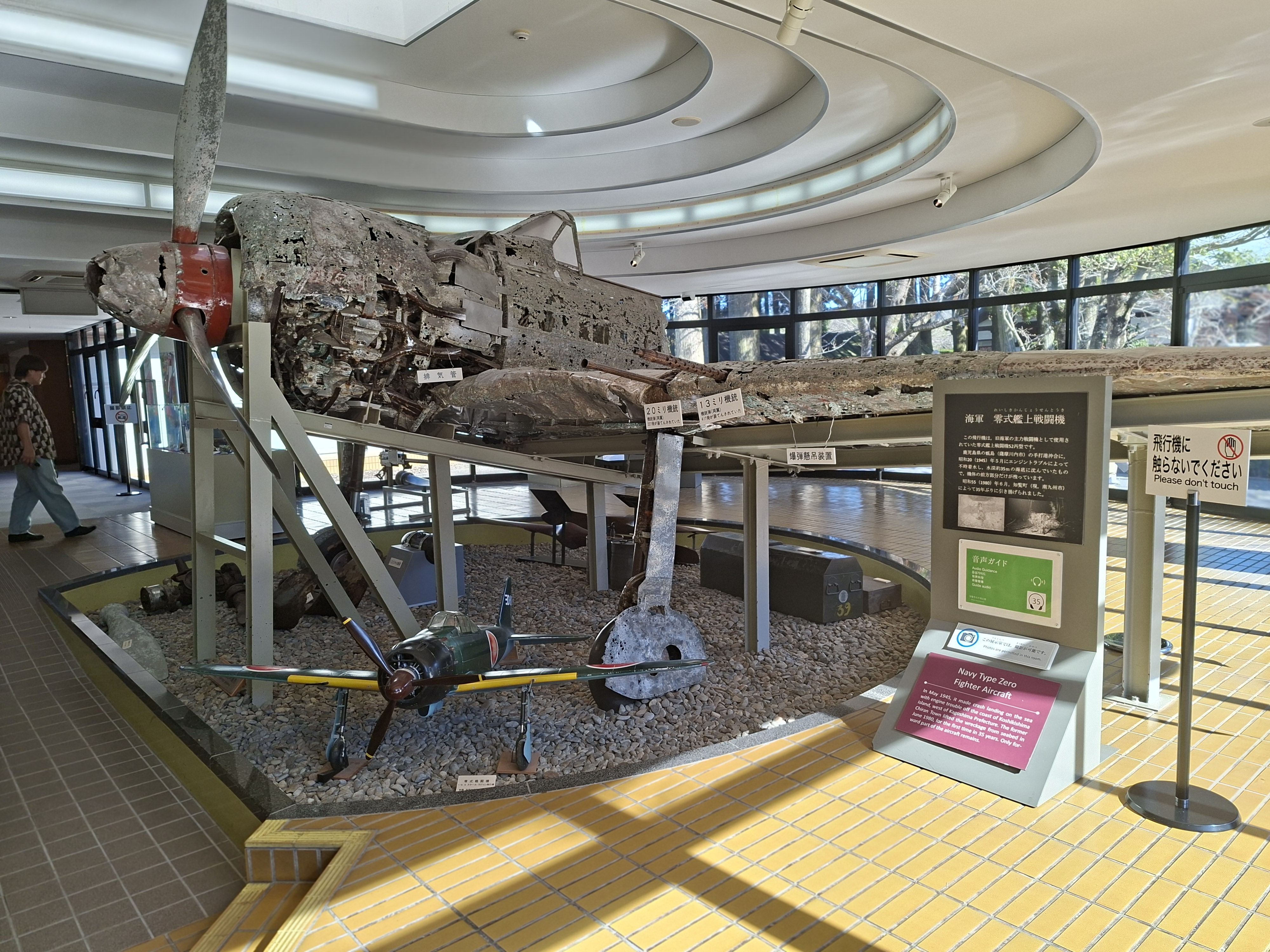 Je suis marqué aussi par une grande photo du Kaimon qui couvre le mur du fond. C’est un mont à l’extrême sud de Kyushu, qui marquait le début des 2h30 que les avions mettaient pour rallier les navires étasuniens cibles à Okinawa. Tant que le mont Kaimon était visible quand il se retournait, le pilote considérait qu’il était encore dans le domaine des vivants. Bouleversant.