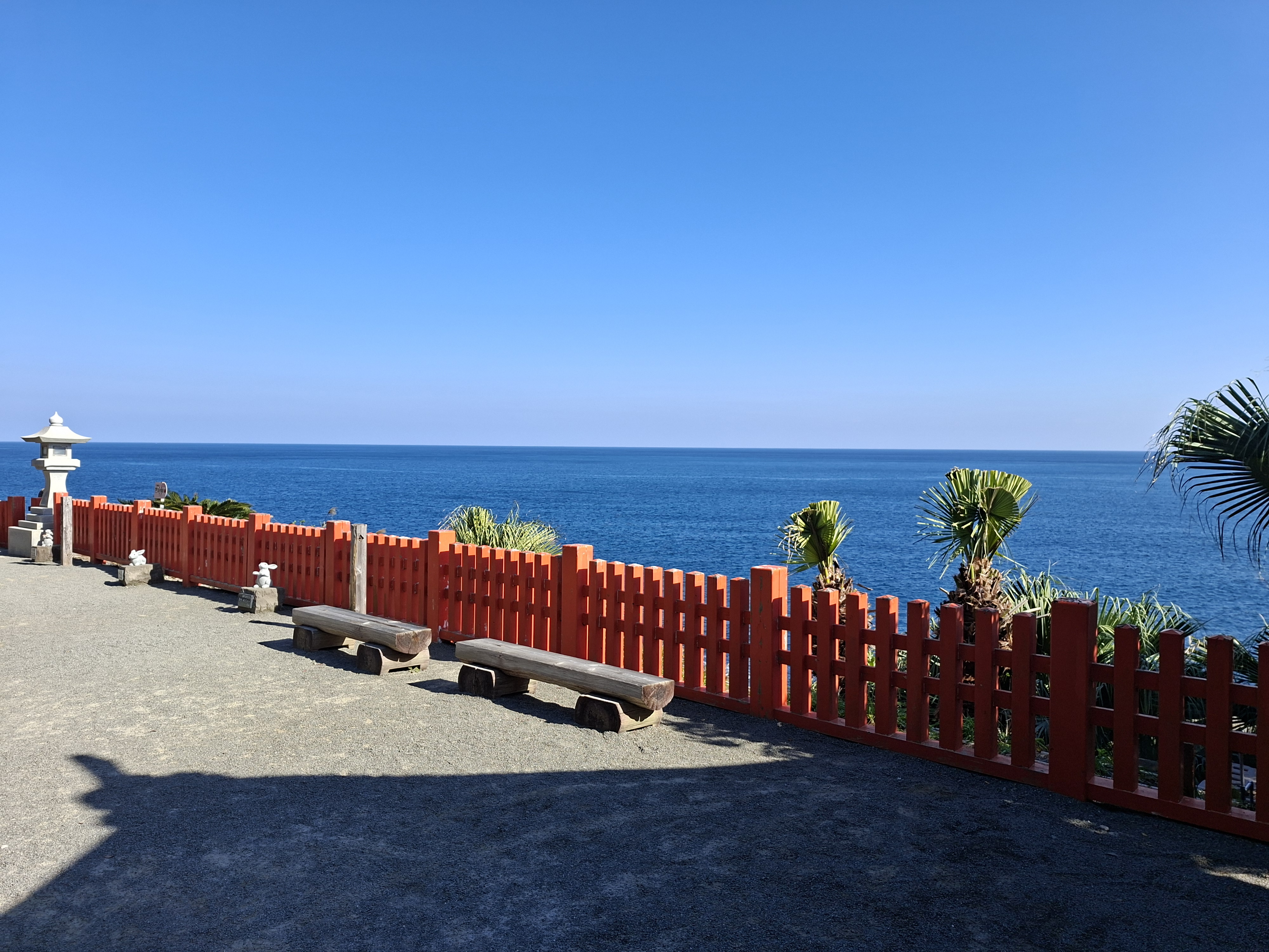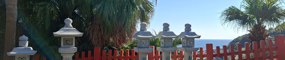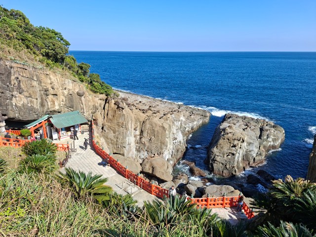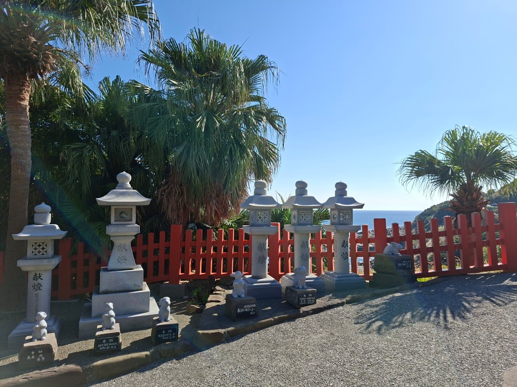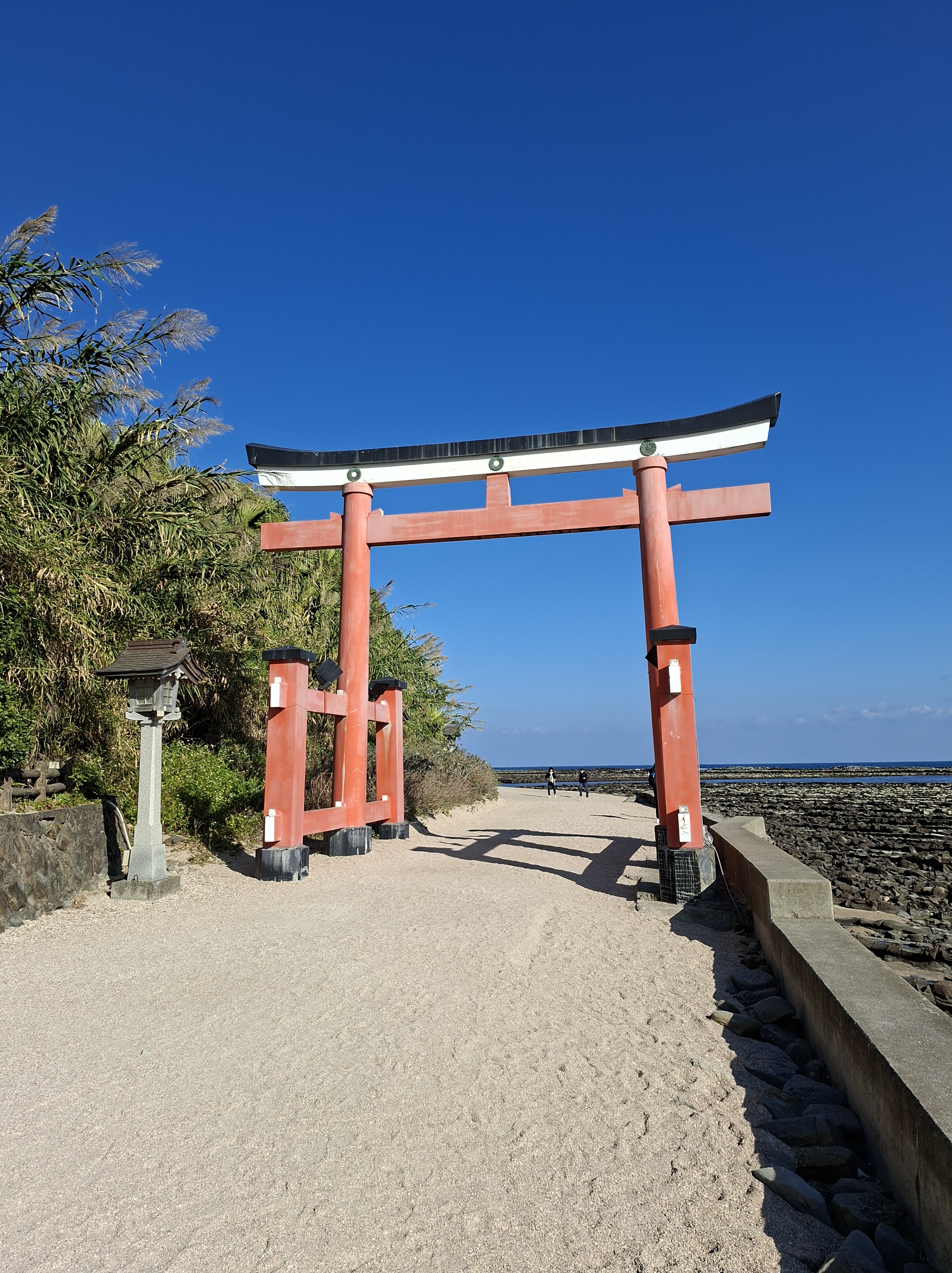 Kirishima était sur ma liste des excursions possibles, mais il y a depuis quelques semaines une zone d’exclusion autour de certains sommets à cause d’émanations toxiques. J’aurai au moins vu ces montagnes de loin, et je ne désespère pas de pouvoir approcher un autre volcan plus tard. En partant de Miyazaki, où je constate rapidement que les palmiers sont plus nombreux qu’à Kagoshima, je me dirige vers le sud, voir le sanctuaire shintō Udo Jingu qui s’avère être formidable.