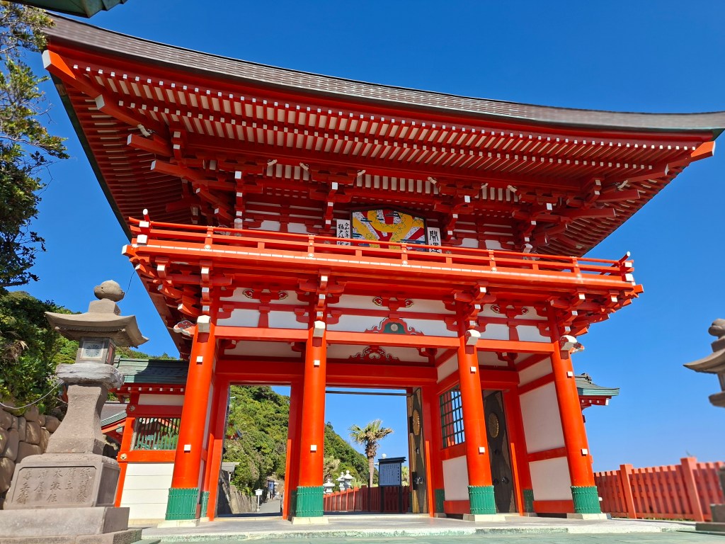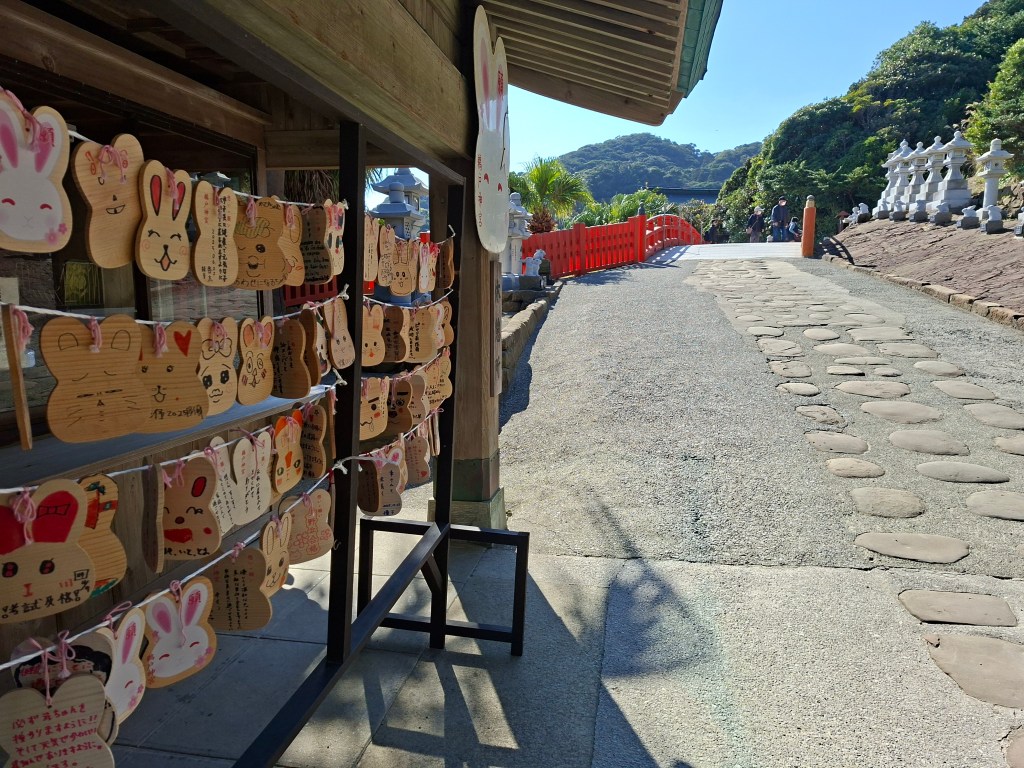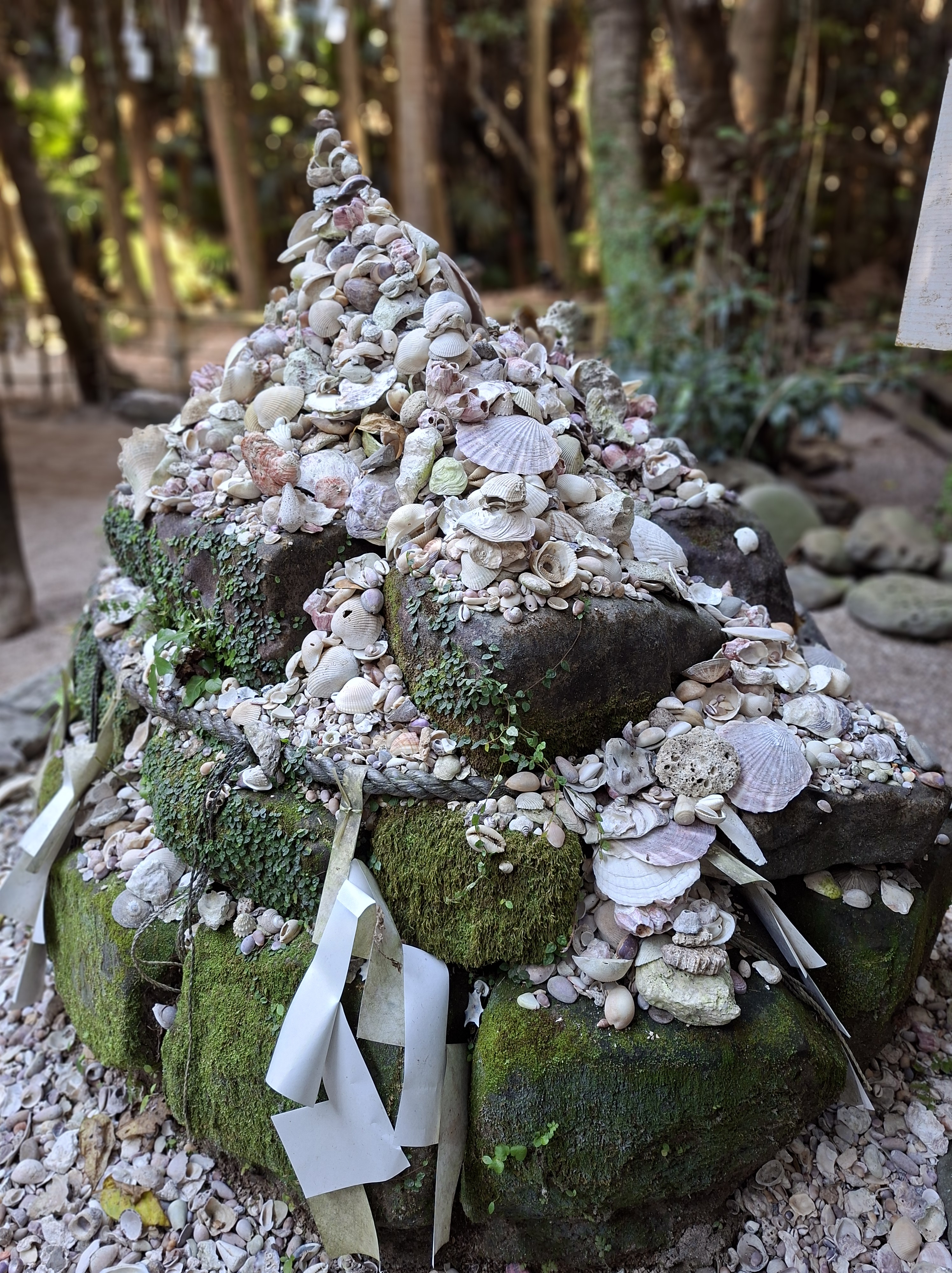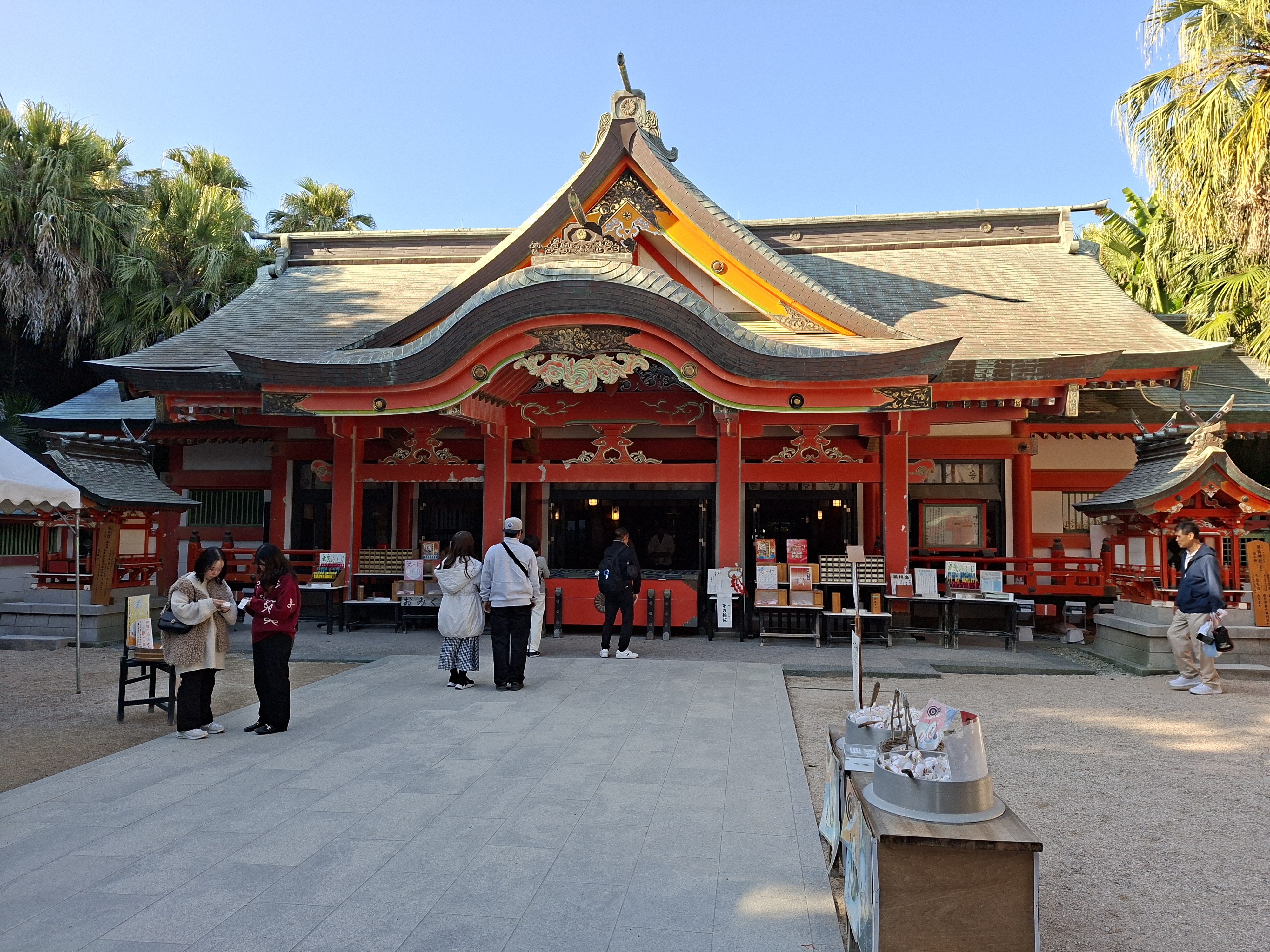 Kirishima était sur ma liste des excursions possibles, mais il y a depuis quelques semaines une zone d’exclusion autour de certains sommets à cause d’émanations toxiques. J’aurai au moins vu ces montagnes de loin, et je ne désespère pas de pouvoir approcher un autre volcan plus tard. En partant de Miyazaki, où je constate rapidement que les palmiers sont plus nombreux qu’à Kagoshima, je me dirige vers le sud, voir le sanctuaire shintō Udo Jingu qui s’avère être formidable.