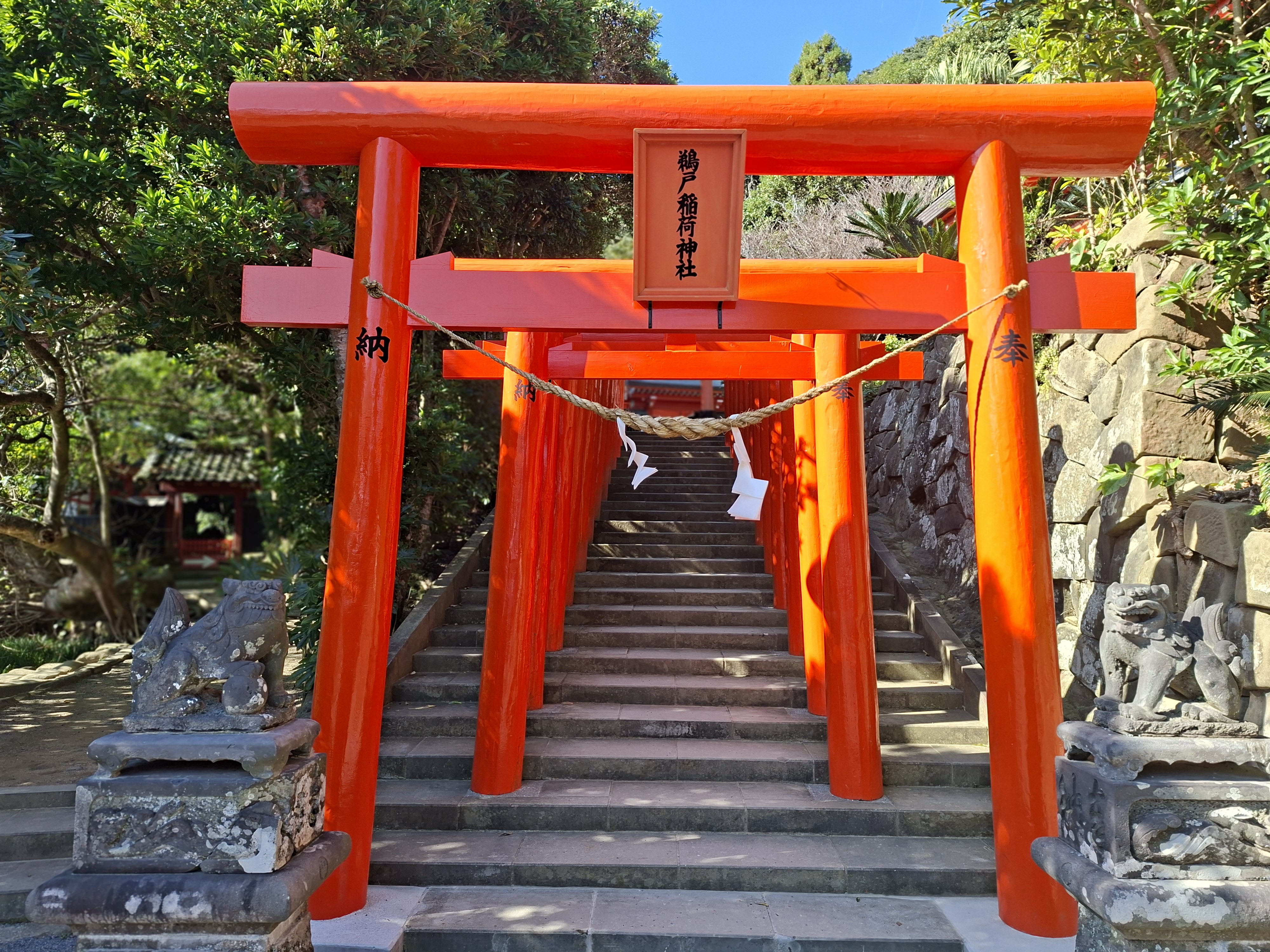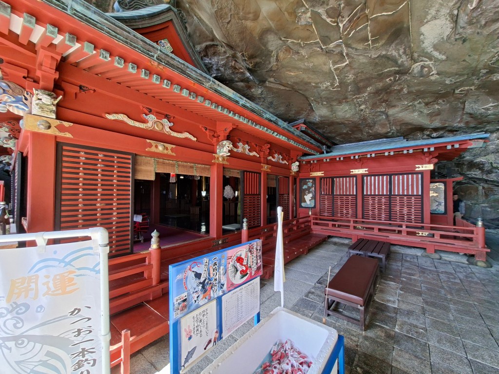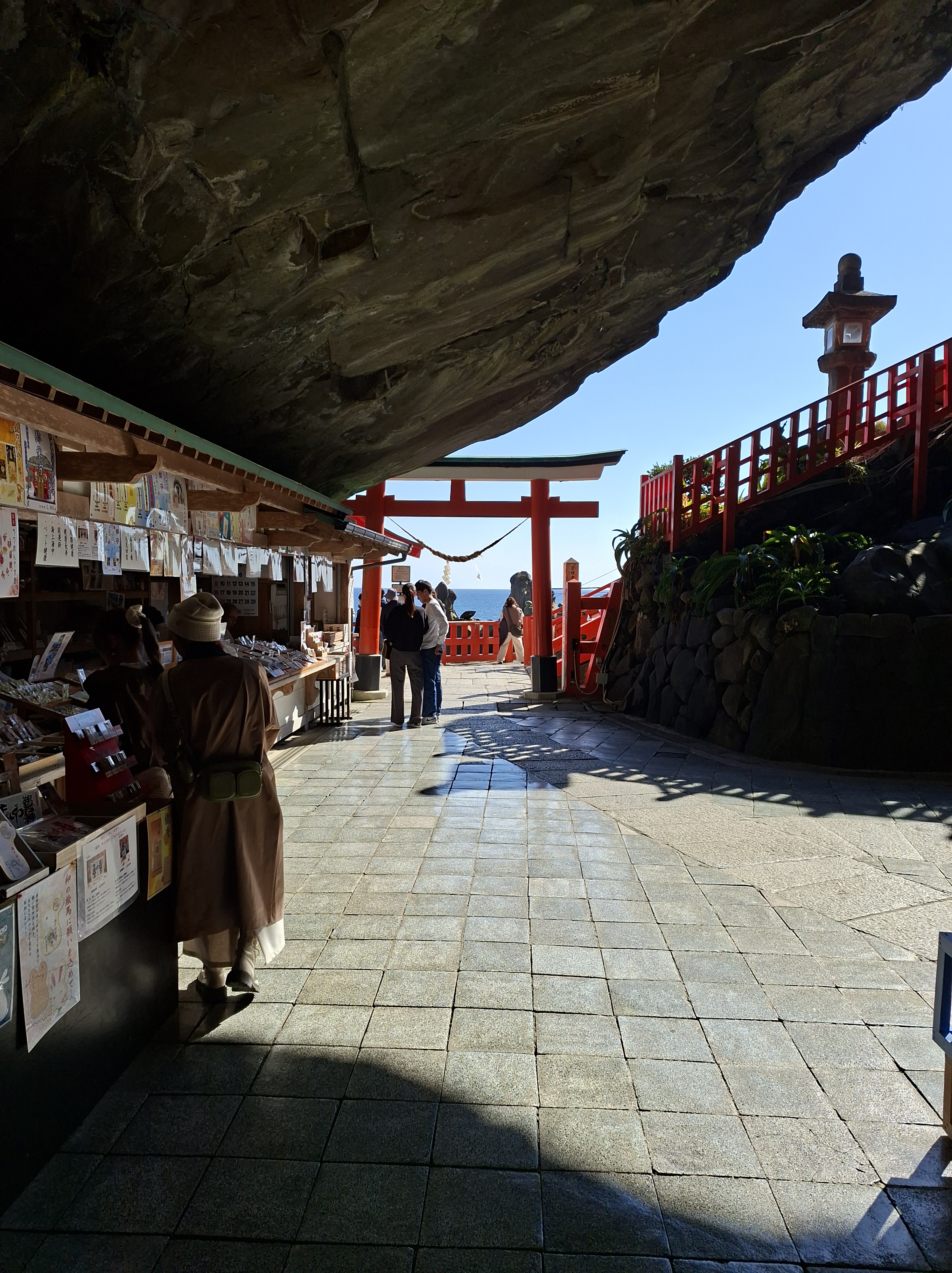 Un grand torii, une barrière au dessus de la mer, un escalier, une terrasse et une caverne, dans laquelle est caché le sanctuaire principal.