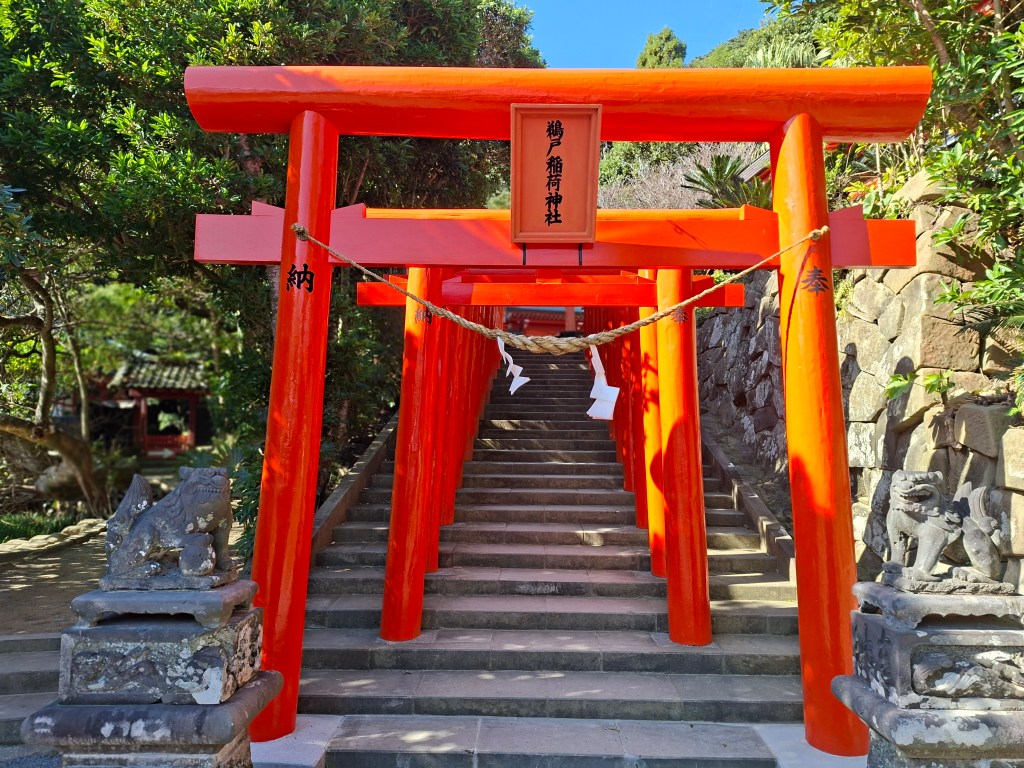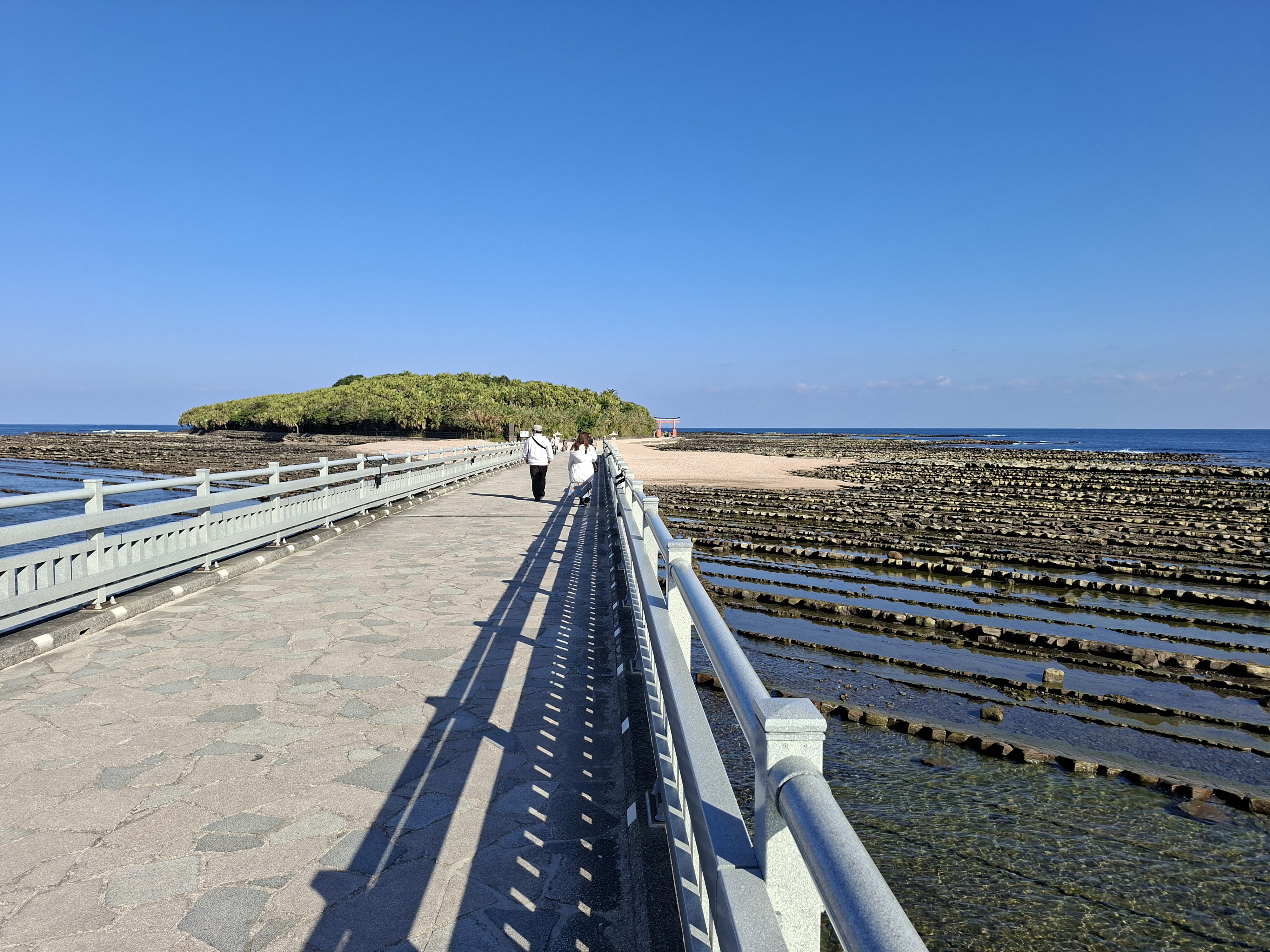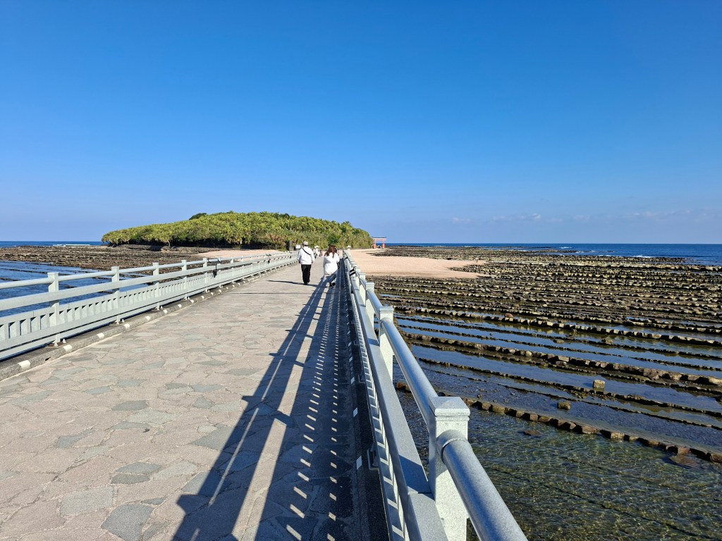 Je reprends le maudit bus, pour aller à présent à Aoshima, une petite île accessible par un pont, entouré de curieux rochers plats et alignés. C’est parfois beau la nature. Et c’est enfoui au milieu des palmiers que se cache un autre petit temple shintō, tout aussi charmant.