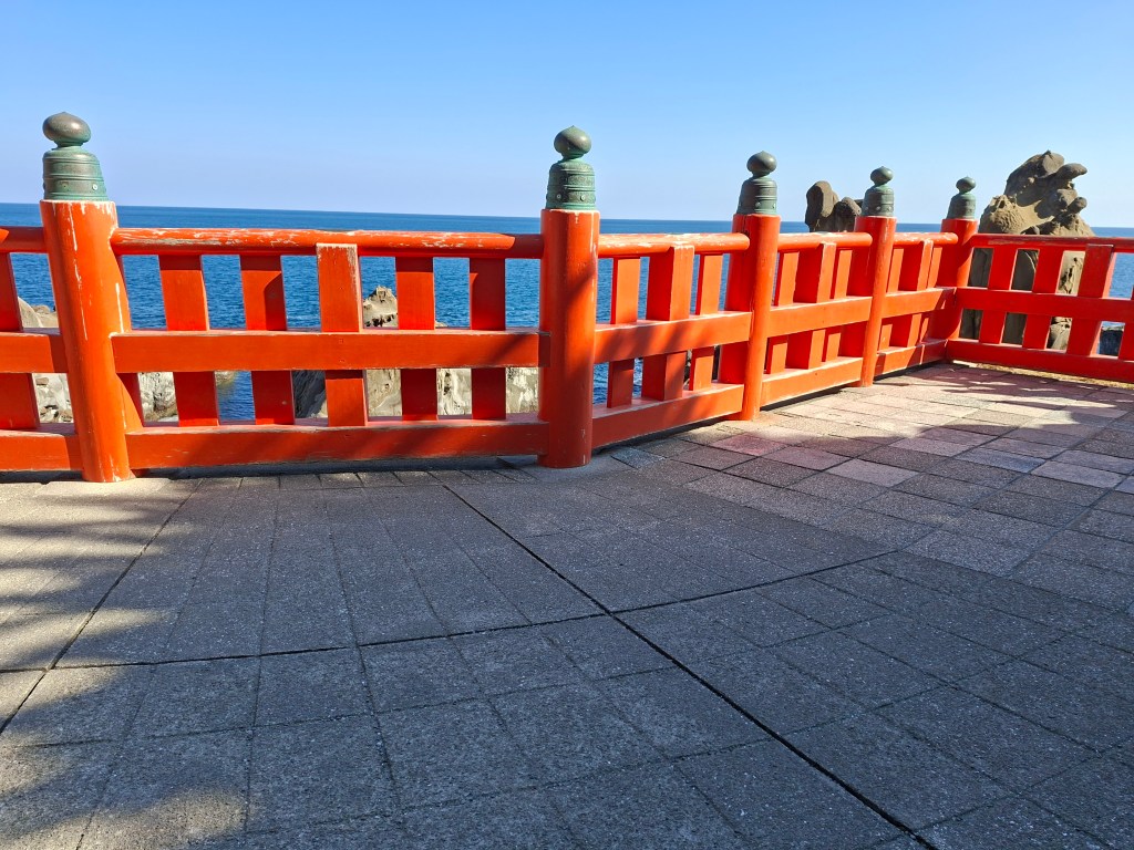Là où le dégradé céruleen de l’air et le bleu profond de l’océan s’associent pour offrir à nos rétines avides de beauté le plus majestueux des camaïeu azur, créant une toile de fond qui sublime les bois recouverts de cette délicate peinture vermillon propre à la religion shintō.