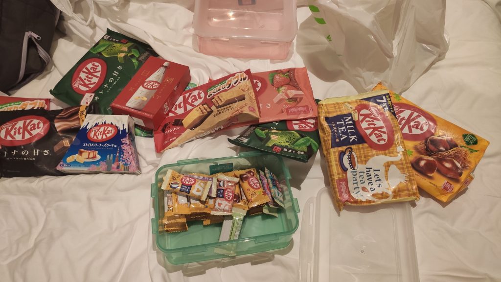Passage obligé à chaque voyage au Japon, la chasse aux multiples parfums locaux et temporaires de Kit-Kat. Il faut toujours avoir de la place dans la valise pour en ramener, pour sa consommation personnelle et son entourage. Et avec des morfales comme Dom ou Marianne “Minipousse” (mais Maxiappétit) mieux vaut prévoir la quantité. Afin de ne pas mettre tout en vrac dans la valoche au risque d’émietter les divins biscuits, je recommande les boîtes de 2.6l actuellement en vente chez Daiso, cette célèbre enseigne de tout-à-100-yens ou à-multiple-de-100-yens. Rajouter 10% de TVA à la caisse.
